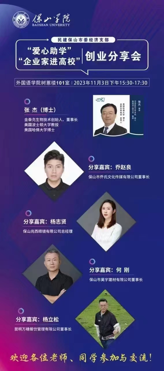 受云南省保山民建市委的邀請在保山學(xué)院給同學(xué)和老師們進(jìn)行了創(chuàng)業(yè)主題的演講,和大家分享了“金泰克”創(chuàng)業(yè)的理念,創(chuàng)業(yè)的模式和方法,創(chuàng)業(yè)的艱辛和痛苦,以及創(chuàng)業(yè)成功的喜悅。同時拜訪了寶山本地最大的民營德康口腔醫(yī)院,并為共建哈佛博士工作站達(dá)成了協(xié)議。